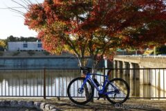 15:20 亀山湖畔公園の駐車場に駐車して、亀山湖一周サイクリングをスタート。亀山ダムのもみじはちょうど綺麗に紅葉している。