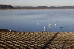 07:40 写真を撮りながらでも、あっという間に西印旛沼の東岸に到達する。進行方向には、昨日の北印旛沼でも見た円筒形の構築物が見える。沼には水鳥が朝の会議をしている。