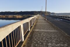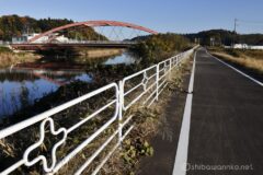 サイクリングロードを進むと、赤いアーチ橋の双子橋に連絡する。双子橋から見る朝の西印旛沼が清々しい。