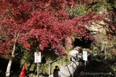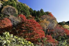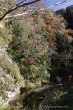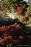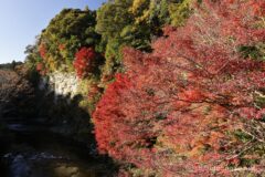 養老川に架かる国道465号線より1つ下流に架かる橋から養老川を見ると、懸崖境の紅葉と赤い橋脚が養老川に映り込んで美しい。養老渓谷の斜面は真っ赤な紅葉が点在していてとても華やかだ。国道465号線に移動し、養老川に架かる橋の上からは間近に懸崖境を見ることができる。懸崖境の断層に赤い紅葉が散りばめられていて美しい。ちょうど午後の斜光線でいい光線状態で撮れた。