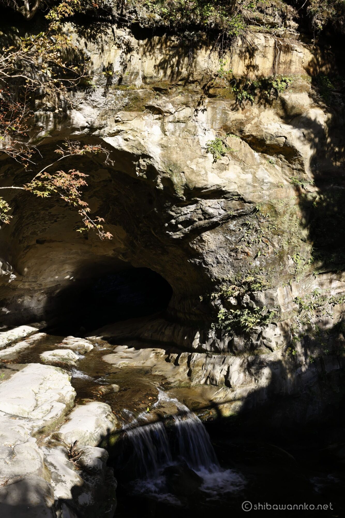 遠見の滝まで来ると、色づいた紅葉の木が数本。赤に橙に黄色と何色もあるのがい。紅葉の奥に遠見の滝。遠見の滝は川廻しの人工の滝。落差は遠目に見ても1mくらい。これは滝か?と思わんばかりの小ぶりっぷりだけど、切り通したトンネルから流れ出る様がなかなか味がある。川廻しは、千葉県で多く見れる蛇行した河川を人工的に短絡させる工法。ちょっと寄り道したらいいもの見れた。