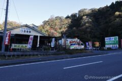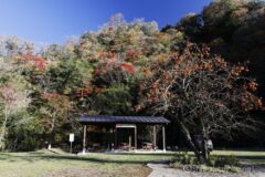 山の駅 養老渓谷 喜楽里へ移動する。ちょっとした距離だが、自転車の機動力が有難い。喜楽里の敷地内に入ると、バーベキュー場の手前に柿がたわわに実っている。背景の紅葉の斜面も合わさって、妙に心に残る風景だ。