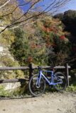 目的の遠見の滝は、山の駅喜楽里の敷地の奥にあり、徒歩1分ほど。奥まったところにあるので、気づかない人もいるかもしれない。遠見の滝よりも、川の流れの向こうの地層が露出している老川露頭と紅葉の方が目に付く。ここも紅葉が見頃でなかなか綺麗。これぞ渓谷美といった感じ。せっかく自転車で来たので、ピナレロF5との記念写真を忘れずに撮っておく。