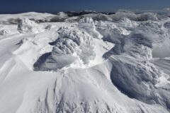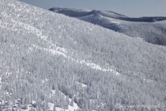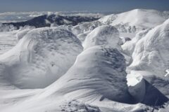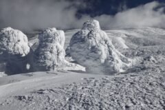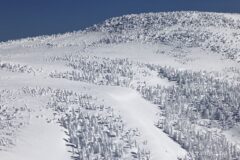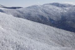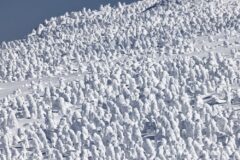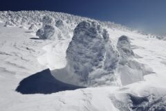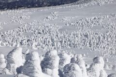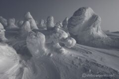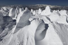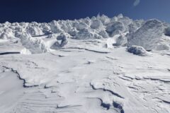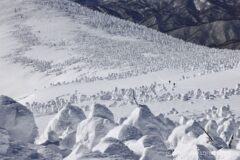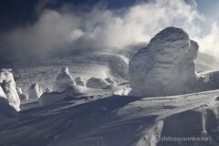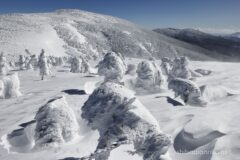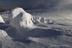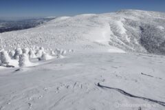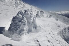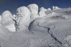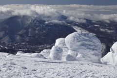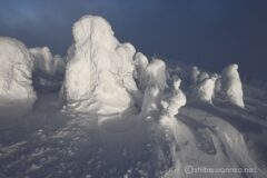 パーフェクトに成長したスノモンたちとお別れするのが名残惜しい。朝焼けは撮れなかったけれど、これ以上最高のスノモンに会うことは難しいだろう。少し下りては山頂を振り返りながら。