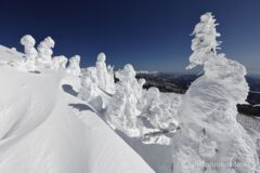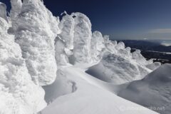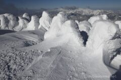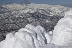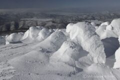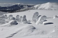 そして穢れなき雪の斜面を覆い尽くすスノモンを撮ってゆく。いや、凄いスノモンの数だ。これを絶景と呼ばずしてなんと呼ぼう。西吾妻山のスノモンの稜線の奥に見える真っ白い山は蔵王かな。その奥にも白い高い山が見える。東吾妻山方面もスノモンでびっちし。けど西大巓~西吾妻山のスノモンの方が明らかに大きい。のっぺりとした西吾妻山山頂はこれまたスノモンで覆い尽くされている。凄いね、スノモン数えようと思えば数えられるけど。w