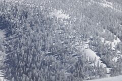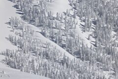 ここのオープンバーンを気持ちよく滑ってしまった後に待ち受けるのは、巨大なスノモン密集地帯。人がスッポリはまるほどの大きなツリーホールが連続し、とても自分の技術では滑れない。登山道に合流するために、トラバースでスノモン密集地帯を回避する。