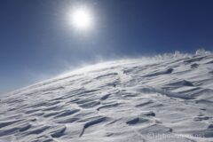 おおおおお、くるかくるか!そして徐々にスノモンが雲から現れ始め、ついに西吾妻山まで晴れ渡った!冬の嵐のおかげで、スノモンは完璧に白く大きく、人の足跡が1つも残っていないパーフェクトな雪景色が目の前に現れた。やったね!朝焼けは撮れなかったけれどこれはこれで良しとしよう。