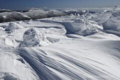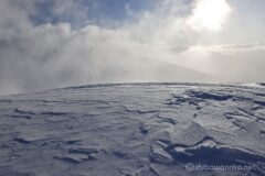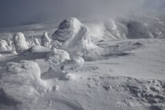 時折見え始める青空とスノモン。そして遠くの山並みまで一瞬見渡せるときもあるが、またガスに覆われる。そうこうしているうちにだんだんと晴れるタイミングが多くなってくる。もう少しだ!頑張れ太陽。しかし今日はなかなか晴れてくれない。一瞬だけだがスノモンが埋め尽くす西吾妻山稜線が見える瞬間は心が躍る。山は嵐から明ける瞬間が美しい。スカッと晴れ渡った写真もよいが、この荒々しい瞬間を捉えた写真の方が自分的には好みだ。
