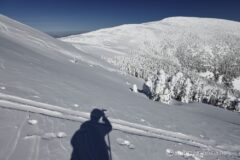 自分のバックカントリースキーの技術が未熟なのは重々承知なうえ、撮影機材でレンズ3本(2本のつもりだったが持ってこない予定のレンズが1本入っていた)と三脚まで背負った重荷なので、怪我だけはしないように慎重に。重たい雪だけどなんとか滑れて楽しめた。