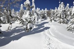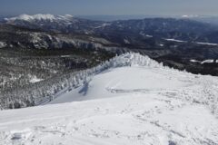 誰もいないノートレースの穢れのないスノモンヶ原を進んでゆく。スノーシューのように沈み込まずに楽に移動できる。スキーでの雪山トレッキングが、山をやっている中で一番の極上の体験だと思えてくる。こんな素晴らしい景色の中を歩けて、今後雪山は樹氷トレッキングに重点を置こうかと思えてくる。