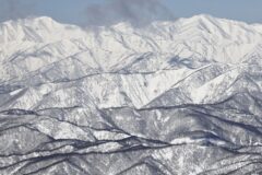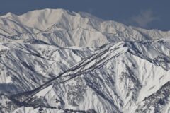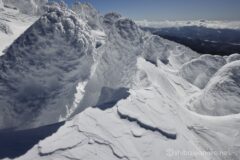ここまで晴れたらこっちのもの。パーフェクトな条件で余すところなく撮り尽くす。こんなときのために、最高画質で撮るために担ぎ上げた100-500mmの超望遠レンズの出番が来た。スノモンの奥には飯豊連峰。もう白い塊でなんだかわかりません。w そして北に少し離れたところには、これまた真っ白な朝日連峰。なんとなく一番尖がった山が大朝日岳というのは分かるぞ。