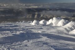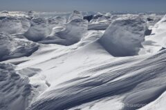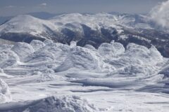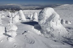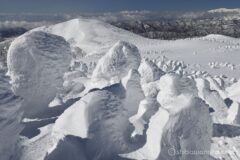 11:00 スノモンを掻き分けてだだっ広い空間に出ると、そこが西吾妻山山頂。広い空間にスノモンが並ぶ異世界のような光景だ。スノモンに下部が遮られるが、周囲の山並みが見渡せる360度の展望。西吾妻山山頂も自分一人。冬の嵐後、自分が一番最初の登頂者のようだ。誰もいない山頂から山頂景色撮りまくり。