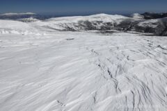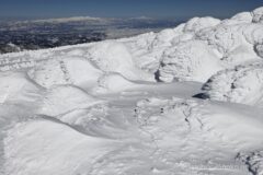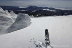 西大巓から山頂スノモンを超えて反対方面へ出れば、東側の展望が開ける。晴天が約束されたこの機会に、西吾妻山だけでなく東吾妻山方面へ、行けるところまで行ってみても良いかと思ったけれど、東吾妻山方面はやや雪が少なく白く雪で覆われていない斜面が多い。そうであれば西吾妻山まででいいか。
