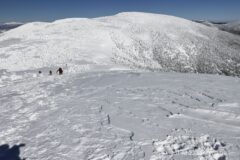 先ほどまでいた西大巓には人がいっぱい。リフトの動くゲレンデを、営業時間外にナイトハイクするおバカな登山者は、今日は自分以外にいなかった様子。西大巓の奥の荒々しい山々が迫力あり。南会津の山々だろうか。全部登ったことあるはずなんだけれど。スノモンヶ原を縫うように登山者が次々と登ってくるのが見える。山頂風景も撮り尽くしたし、次の磐梯山もあることから、そろそろ下山しましょう。