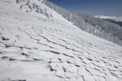 西大巓直下のスノモンも大きく成長して立派なことと言ったら。登山道の脇にオープンバーンがあるので、せっかくなので登山道を外れてオープンバーンを滑ってみることに。昨年とんでもない濃いいホワイトアウトを食らって、氷点下16度でスマホGPSが死に、予備バッテリーでも生き返らず、遭難寸前に陥った場所だ。w