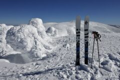 反対側の磐梯山を見れば、まだ磐梯山は雲に覆われている。よかった、今日は磐梯山に登るのではなく西吾妻山が正解だった。このエリアには磐梯山、安達太良山、吾妻連山と大きな山々が隣り合っているが、片方に雲がかかっていて片方が晴れていたりと、なかなか天気の読みは難しい。一応スキーで来たぞ、というスキーの写真も記念に撮っておく。