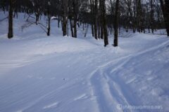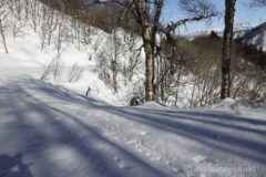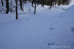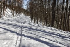 ほぼ平らに見えるが微妙に斜度が付いている。早朝でまだ雪が締まっているので、僅かな斜度でもスキーが面白いように滑ってくれる。これが午後の緩んだ雪だったら果たして滑れたかどうか。10分くらいであっという間に宮谷林道出合まで。これは楽ちんだ。ここでもスキーの威力を思い知った。