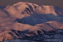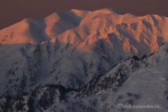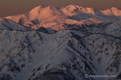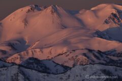 日の出を迎えると、一番高い白山から焼け始める。次いで南方の稜線越しの別山。厳冬期ばりに真っ赤に燃える。いつものように、担ぎ上げた超望遠レンズ100-500mmで切り取り始める。