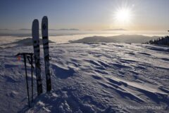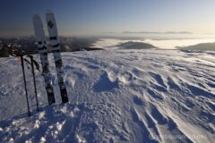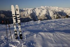 せっかくスキーで登ったので、北アルプスと朝日にスキー板を入れて写真を撮る。自分には到底無理だと思われたバックカントリースキーも、近年なかなかの出動回数だ。これだけの貴重な経験をさせてくれて、山スキーを始めて本当によかったと思える。いろいろ背景を変えて。北アルプスと朝日もいいけれど、やっぱり白山と一緒が一番かな。