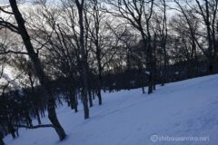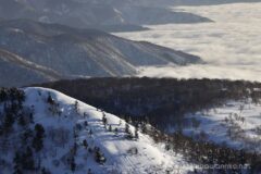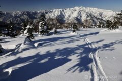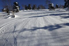 三角点ノ台地までくれば方向を変えて、白山に向かって滑り降りてゆく。こっちのロケーションも最高だ。雪質はやや硬い雪面にパウダーが乗っている。小回りのシュプールを刻む。右側を登って左側に滑ってきた。この整地されたスキー場のようなバーンだったら、自分でもコントロールできる。
