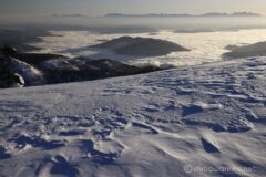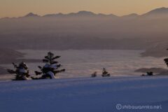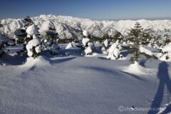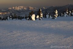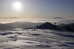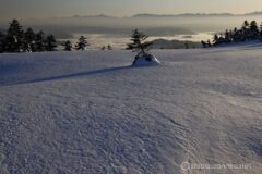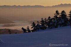 乗鞍岳と御嶽山までくっきり。日が昇って色が抜けて、真っ白な世界に変わる。真っ白くなったら撮影終了。二度来るとはなかなか思えないので、白くなった山々も入念に撮っておく。