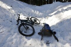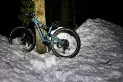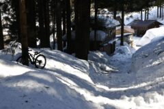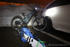 標高差が1,400mあり、上部でどのくらいの降雪がありラッセルを強いられるのか分からない。夜明けまでに十分時間があるとは言えないので、早く出発したいがここで問題が1つ。周りは杉林のため、ザクを地球ロックするための人工物が何もない。チャリを盗られては大損害。なんとかワイヤーロックで地球ロックできるだけの細い杉を見つけて括り付けることができた。