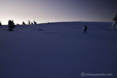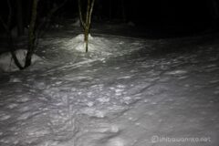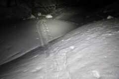 3:00 宮谷林道出合まで来ると、尾根道とスキーヤーが使う谷筋に分かれる。直前までどちらで行こうか迷っていたが、唯一残ったスキートレースは谷筋に進んでゆき、尾根道にはトレースなし。ここはもうトレースのある谷筋でしょう。尾根道を選択したら、ルートファインディングとフルラッセルで、夜明けまでに山頂に届かないのは明白だ。僅かに残るたった1本のスキートレースが山頂まで続いていることを祈って、谷筋を進む。