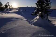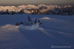 滑らかで広大な猿ヶ馬場山山頂。広い山頂の向こうには北アルプスの峰々と朝日。素晴らしい光景だ。笈ヶ岳と大笠山の朝焼けを撮りたかったため、撮影場所を山頂ではなく三角点ノ台地としたけれど、山頂で日の出を迎えたならば、ピンクに染まる広大な山頂と朝日の絵が撮れたのか。う~ん、どっちがよかったのか。片方しか撮れないから、これでよかったことにしよう。
