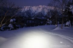 初めての山でしかもスキーでのナイトハイク。地形は頭に入れてGPSも準備しているが、周囲の地形が暗くて把握できないので、GPSがあろうとも雪道を正確にルートファインディングするのは困難だ。トレースがなかったら結構厳しいだろうぐらいに、あまり人が入らない雪山を甘く見ていたことを反省したが、運も実力のうち。昨日のものか一昨日のものか分からないけれど、トレース頑張れ!
