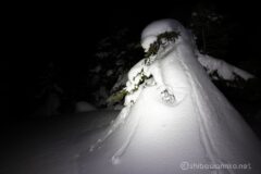 00:50 白川郷道の駅から登山口まで、約3kmのチャリアプローチ。チャリにスキーに撮影機材を背負い、総力戦だ。電動アシスト自転車で坂道もない平坦路なので、3kmなんて楽々あっという間。夜の白川郷は寝静まっている。闇夜に照らし出される白川八幡神社。こんな時間に山に入るなんて、とっても酔狂な人間に違いない。w
