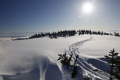 雪が硬くて急斜面なので、面白いように斜滑降が決まる。そうか、斜滑降は急斜面の方がやりやすいんだな、なんて新たな発見をしつつ、安全第一に慎重に滑り降りる。登りで恐怖した標高差500mの超急斜面も、ザリザリ斜滑降で削りながらゆっくり下りてもあっという間。太腿はパンパンになって疲れないわけではないけれど、楽に早く楽しく下りれるのは間違いない。スキーって楽しい。