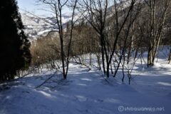 宮谷林道出合から第一渡渉点までは、緩やかに登るほぼ平坦の谷筋を行く。谷は切れ込んでいるが、次第に谷が近づいてきたところが第一渡渉点。今年は雪が多いのか、完全に谷は雪で埋まっていた。