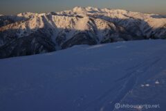 07:40 山頂景色を撮り尽くしたので、下山開始。シールを剥がして滑走モードへチェンジ。なだらかな山頂を滑り始める。振り返れば、自分だけのトレースが刻まれた山頂と朝日と北アルプス。いい山だったけど、なかなか大変だから二度来ることはあるかしら。