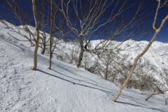 次の上の樺までは、やや傾斜の急にな斜面を直登する。スノーシューだとヒールリフターを使っていい感じに直登できる。しかしこの斜度はスキーだと厳しいだろう。大きくジグが切ってある。