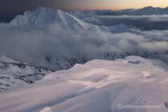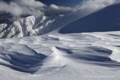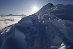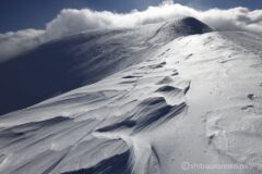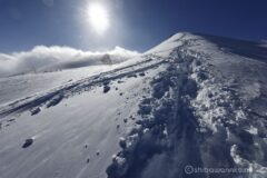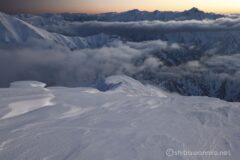さらに進むと、シュカブラが目立ってくる。どんだけ激しい風雪だったんでしょう。朝焼け夕焼けだけでなく、このシュカブラを撮るのも冬の山岳写真の楽しみ。