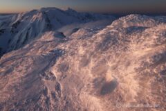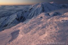 手前の雪面がシュカブラっぽくピンクに染まってくれているので、手前の斜面を多く入れて。不帰キレットから吐き出される雪煙が風の強さを物語っている。