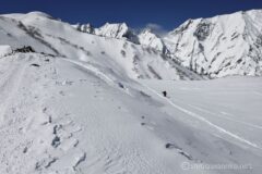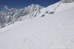 五竜岳の山頂をアップで捉えると、トレースを発見できたが、やや消えかかっている。今日の登山者のトレースだろうか。この大雪後、一番手の人は大変だろう。もはや”壁”としか言えない急斜面のトラバースと登降。五竜岳、恐ろしすぎる。