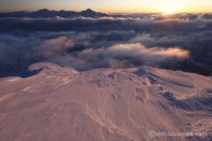 珍しいことに、今日の夕景撮影は自分以外に2パーティ4人がいて計5人。冬期の朝夕の山頂で自分一人でなかった場面の記憶がほとんどない。唐松山荘への分岐から4名がどこから来たのかと確認すると、唐松山荘付近でテントを張っているらしい。