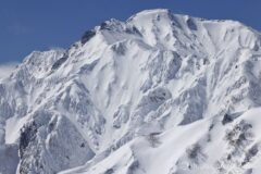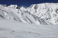 五竜岳の稜線の向こうには、恐ろしいくらいの雪襞を纏った双耳峰の鹿島槍ヶ岳。雪襞をこれほど見れる山って、鹿島槍ヶ岳と五竜岳以外で自分は知らない。本当に何度見ても日本の山とは思えない景色。