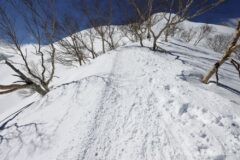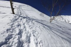 山頂に行くまでの時間は十分見ているので、ゆっくりと高度を上げていく。今日の先行者のトレースが深く刻まれている。50cmくらいあるだろうか。この時期でどんだけドカ雪降ったんでしょう。一番手のラッセル大変だったでしょうに。感謝感謝。