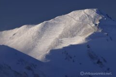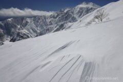 遅い時間の斜光線がいい感じでシュカブラを浮きだたせてくれる。波打つシュカブラの斜面に白馬三山。いいね、超カッコイイ!スキーのトレースがなければもっとパーフェクトだったんだけれど。