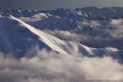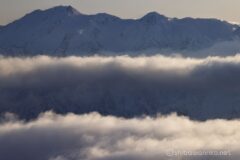 500mmいっぱいまで伸ばせば、槍ヶ岳と穂高も捉えることができる。なかなか見ない角度からの槍ヶ岳だ。剱岳からは立山に延びる稜線は重厚感たっぷり。これまた二段に雲がいい働きをしてくれている。