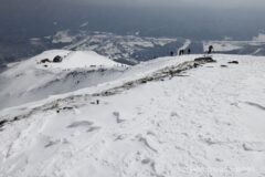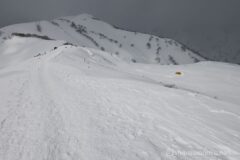 爆風で両ピックを雪面に刺すのは、爆風の乗鞍岳以来か。山頂稜線でテント泊をしていた4名は大丈夫なのだろうか。