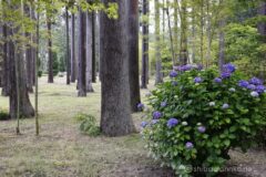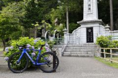 大きな杉林と満開のアジサイ。アジサイとピナレロF5の記念写真。奥の碑は後日調べると鉄道殉職者弔魂碑だった。どうりで車輪があったわけだ。