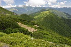 岐阜県側に下りるにしたがって、槍・穂高の稜線の隣に、巨大なピラミダルな笠槍が目立つ笠ヶ岳が見えてくる。笠ヶ岳はね、登るの大変なんですよ。だから今まで1回しか登っていない。w