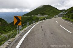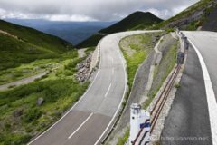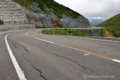 直角カーブを曲がって視界が開けると、烏帽子岳を背景にドーン!と長大なS字ヘアピンカーブの景色が展開する。これはすごい光景だ。山岳展望というより、山を縫うように山と一体化した山岳道路が目を引く。山岳道路の曲線美と言うか、そこを走る爽快感が伝わってくるような景色。一気に下りるのがもったいない。刻んで写真を撮りながら下りてゆく。