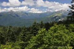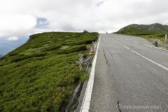 乗鞍エコーラインとの分岐を直進して、いよいよ乗鞍スカイラインに入る。遠くに穂高連峰の山並みが見えるけれど、上空は雲で蓋をされてしまった。