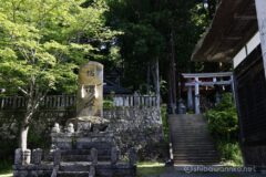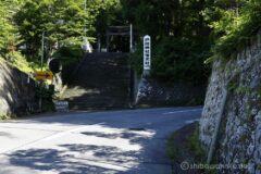さらに少し下れば、戸隠神社宝光社。下から見ると見上げるような急な階段。ここもビンディングシューズの歩きにくさと連休渋滞回避のために立ち寄らず、また次の機会にする。