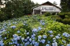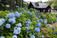 霊仙寺湖からは飯縄山だけでなく、隣の黒姫山もよく見える。いい感じで雲が空に広がっていてくれる。こちらにもアジサイがいっぱい。