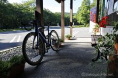 戸隠キャンプ場ウェルカムハウスに日陰になっているベンチがあり。ここで水分とエネルギー補給で大休止。ありがたやありがたや。よくロングライドしていて思うのが、日陰で座れるところが欲しいということ。休むときは座りたいんだよね。